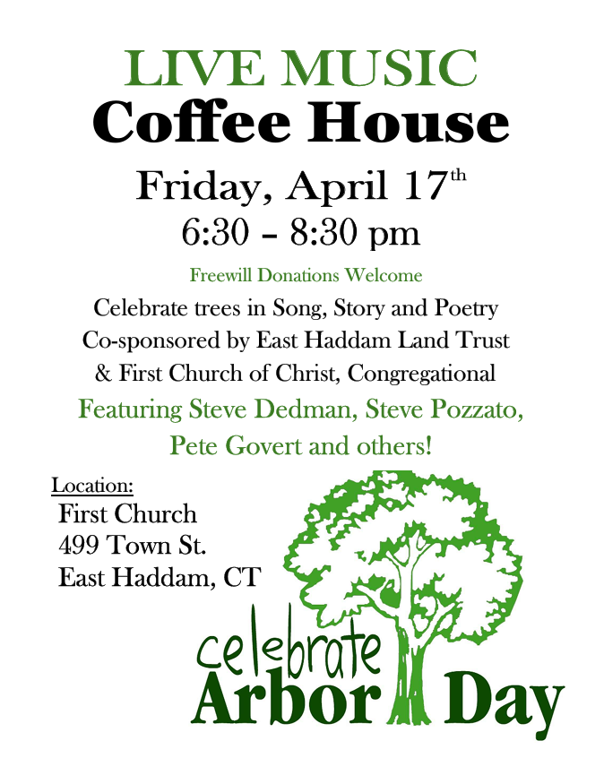 Hosted by the East Haddam Land Trust and First Church of Christ, Congregational at the Church on Town Street. Featuring music by Steve Dedman, Peter Govert, and Steve Pozzato, along with food, poetry, and discussions about trees.