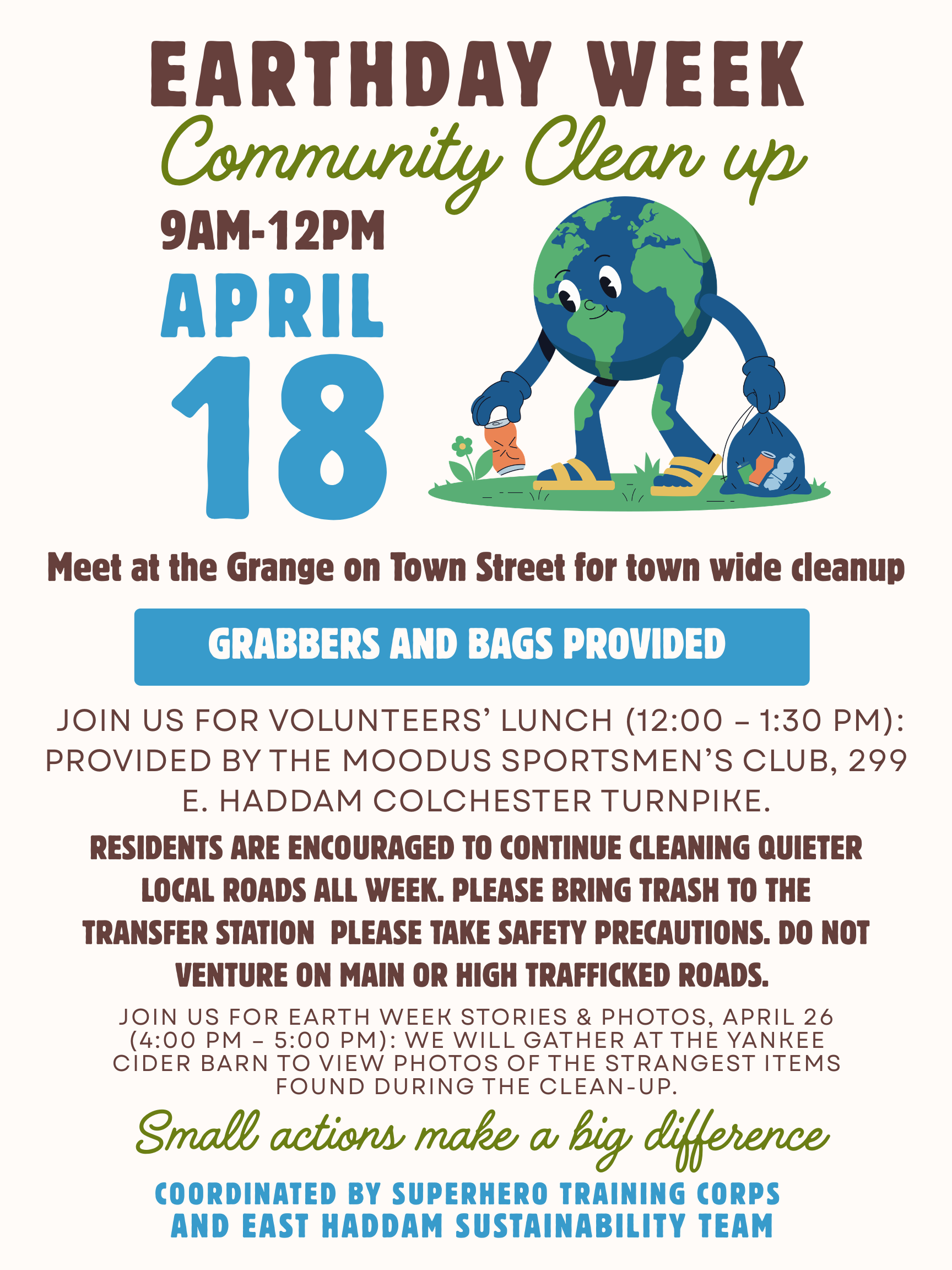 Earth Week Stories & Photos from 4:00 pm to 5:00 pm - The Sustainability Team will gather at the Yankee Cider Barn to view photos of the strangest items found during the clean-up.